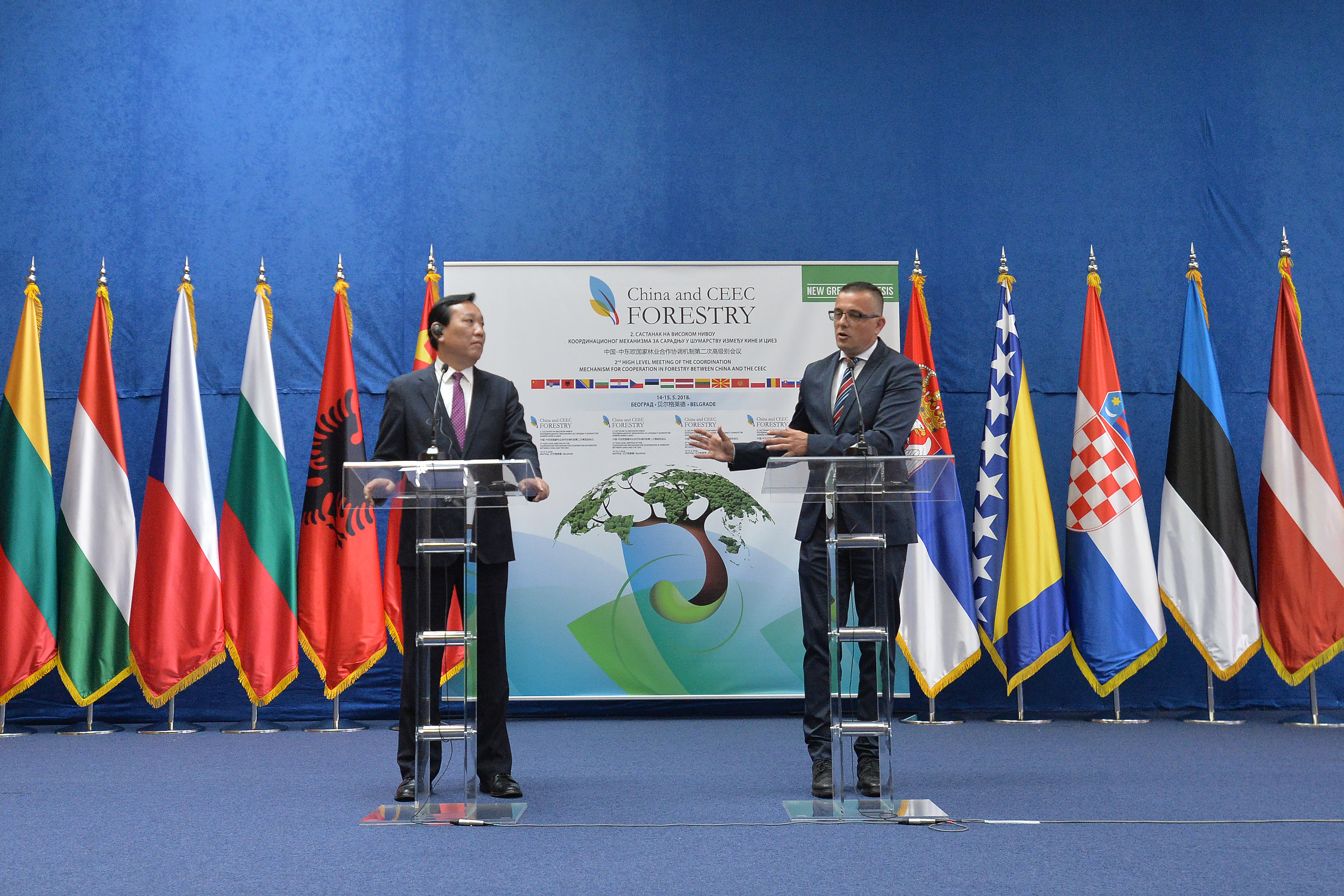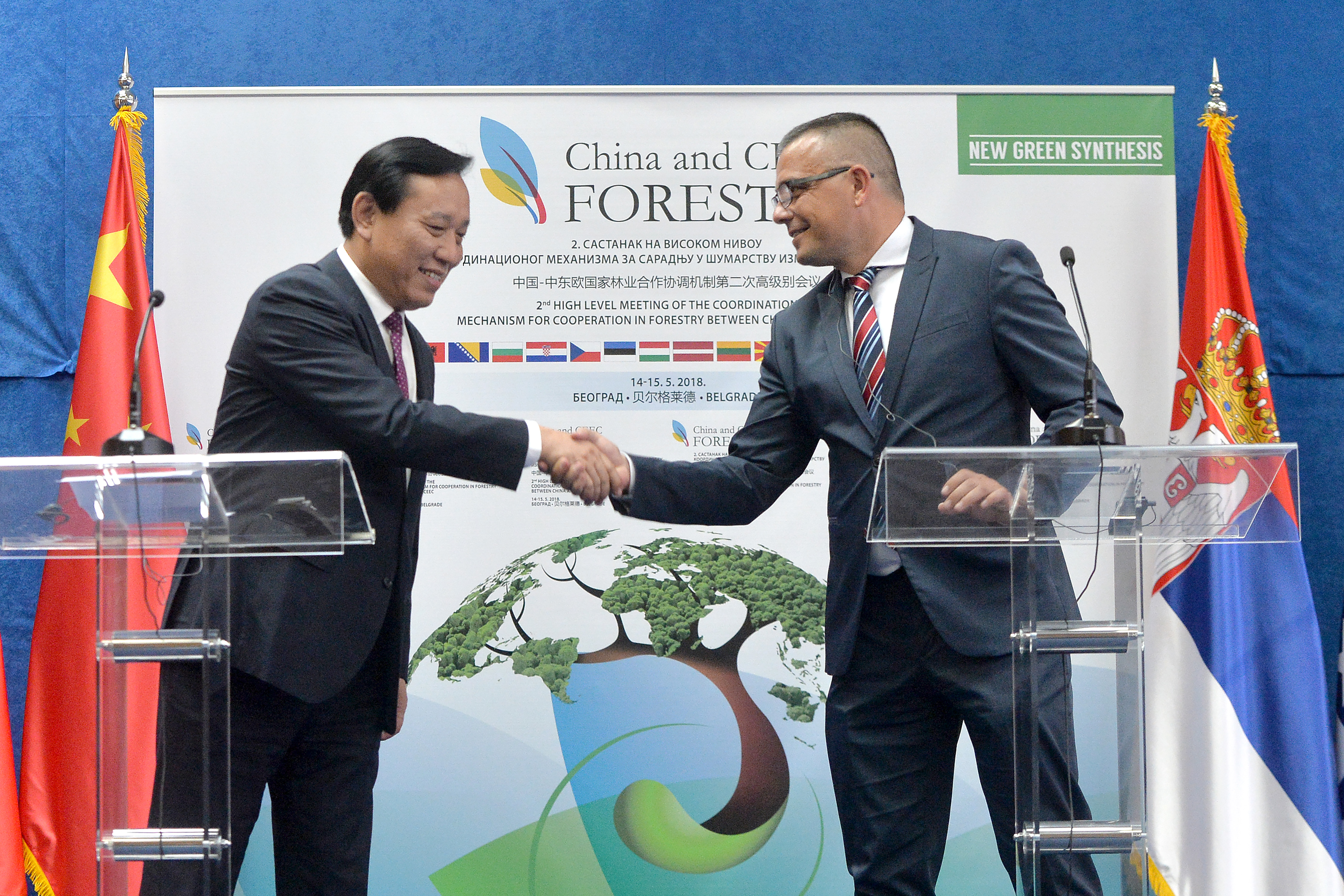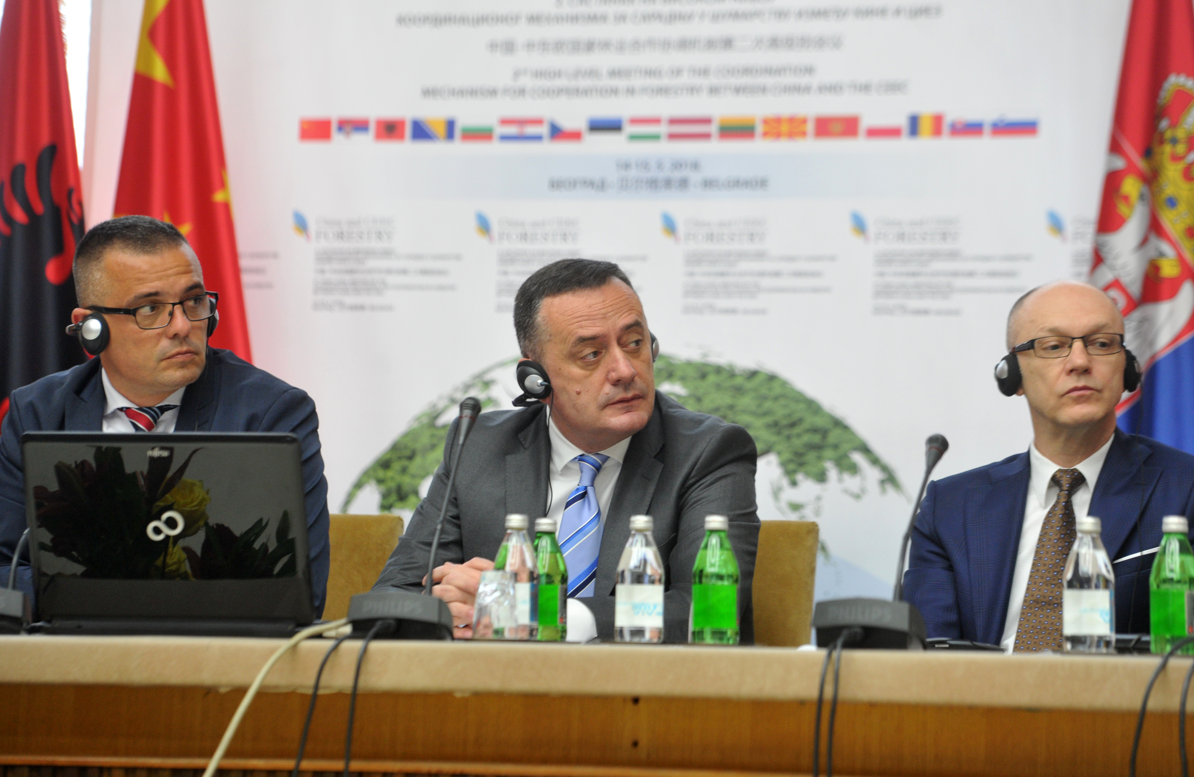 Beograd, 14. maja 2018. – Svecano otvaranje drugog sastanka Koordinacionog mehanizma za saradnju u sumarstvu izmedju Kine i zemalja centralne i istocne Evrope (16+1) na kojem su govorili ministar poljoprivrede, sumarstva i vodoprivrede Branisav Nedimovic (2L) i zamenik direktora Drzavne administracije za sumarstvo Kine Liu Dungseng (3D). FOTO TANJUG / DIMITRIJE GOLL/ bg