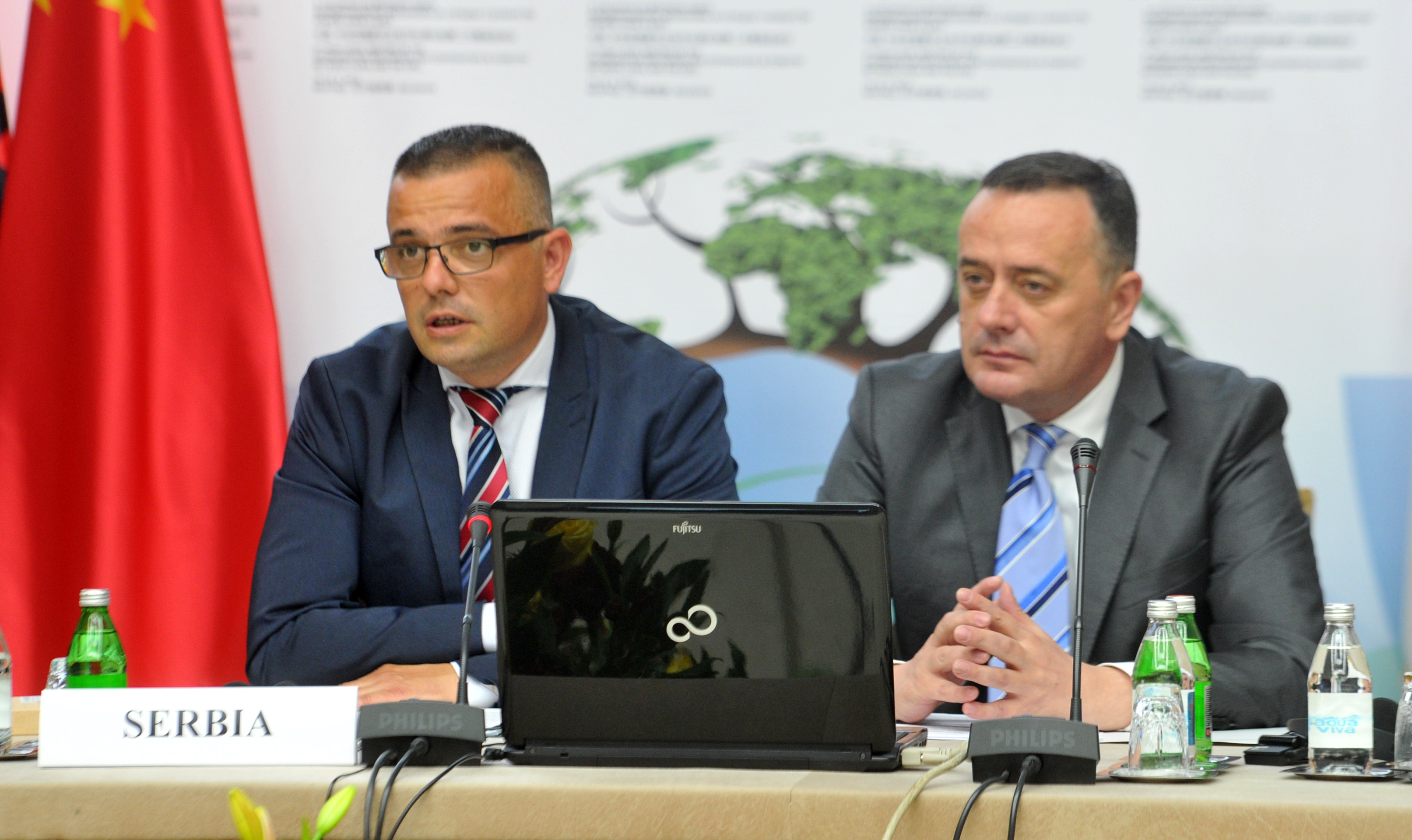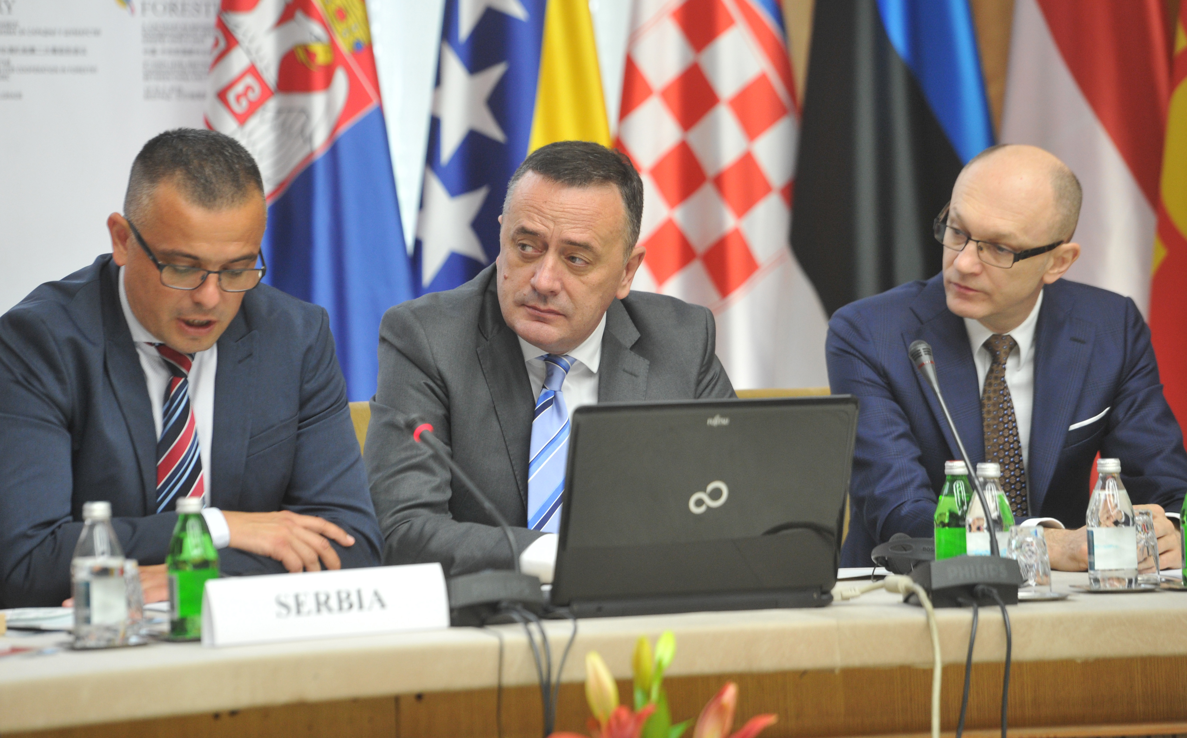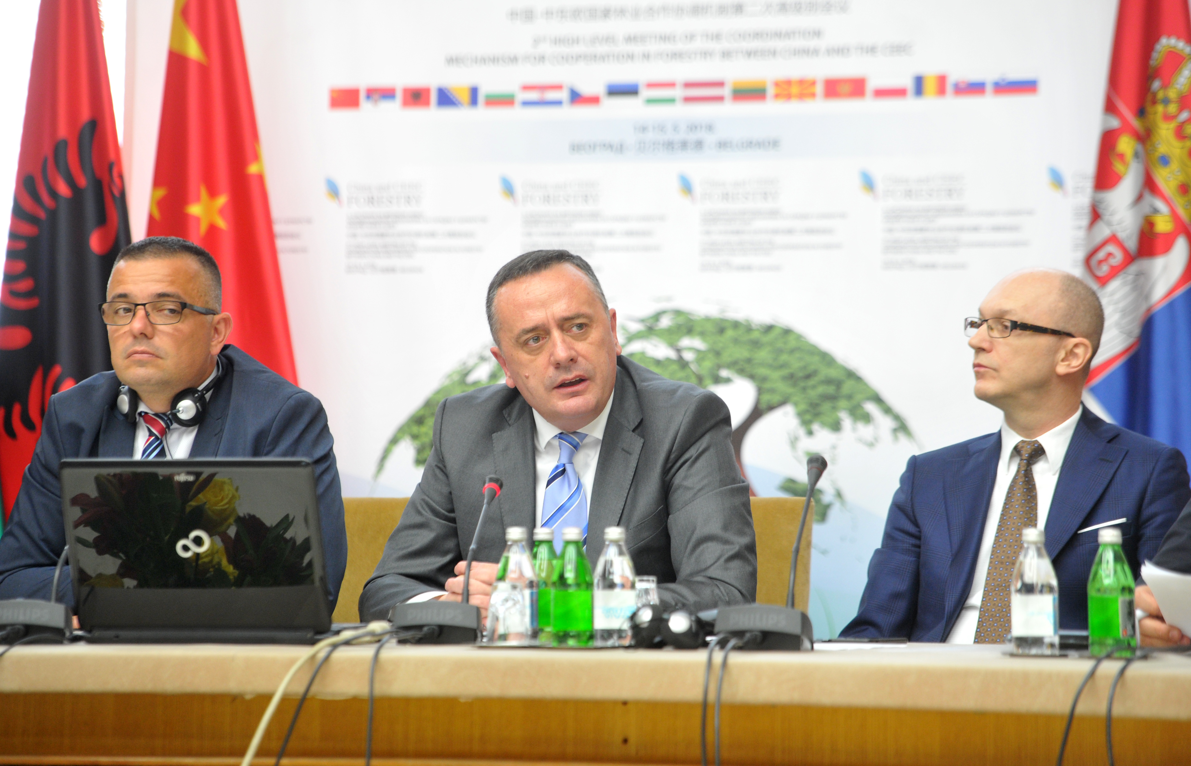 Beograd, 14. maja 2018. – Svecano otvaranje drugog sastanka Koordinacionog mehanizma za saradnju u sumarstvu izmedju Kine i zemalja centralne i istocne Evrope (16+1) na kojem su govorili ministar poljoprivrede, sumarstva i vodoprivrede Branisav Nedimovic (2L) i zamenik direktora Drzavne administracije za sumarstvo Kine Liu Dungseng (3D). FOTO TANJUG / DIMITRIJE GOLL/ bg
