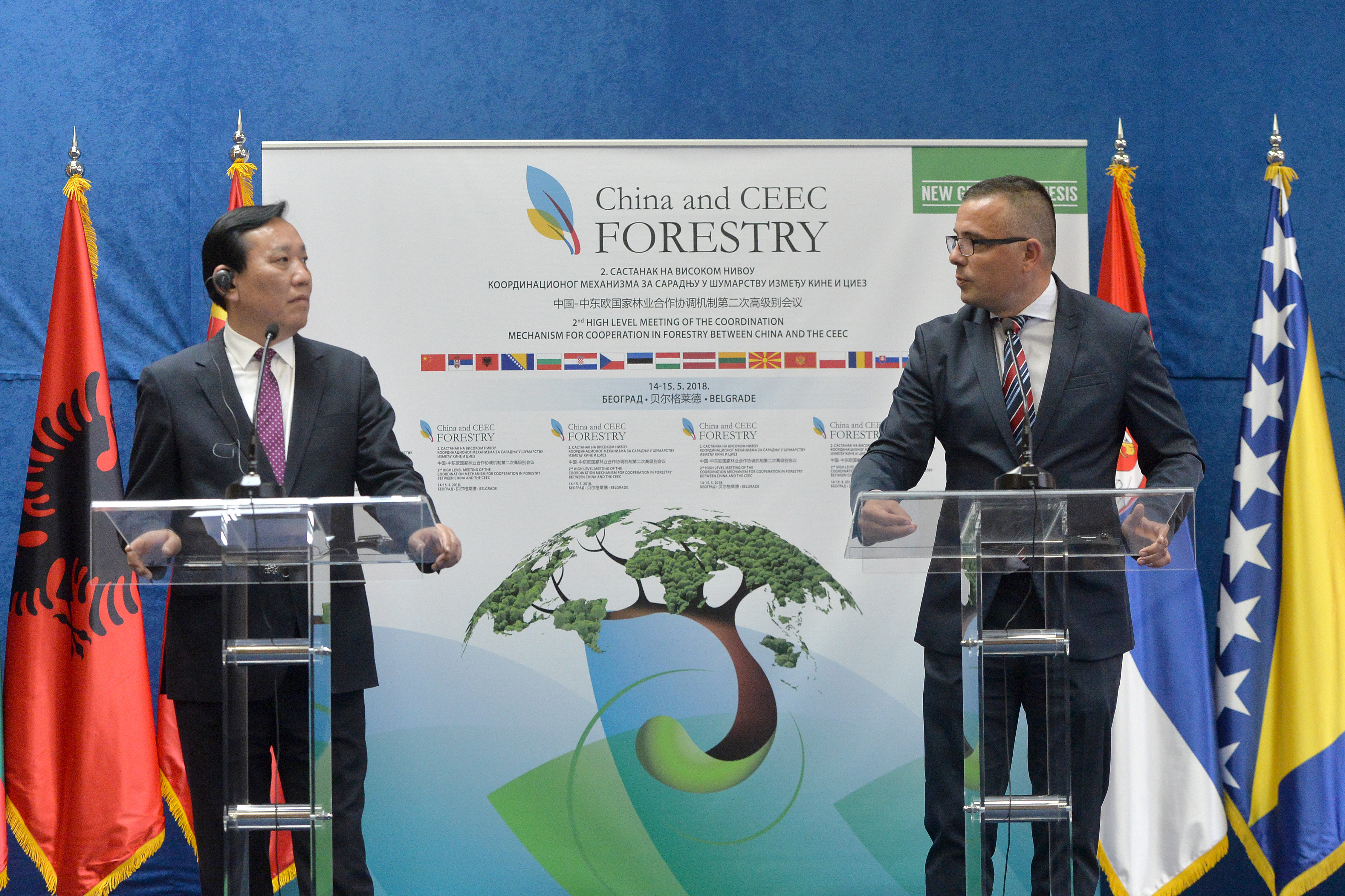 Belgrade, 14. of May 2018 – Ministar poljoprivrede, sumarstva i vodoprivrede Branisav Nedimovic i zamenik direktora Drzavne administracije za sumarstvo Kine Liu Dungseng na konferenciji za novinare nakon drugog sastanka Koordinacionog mehanizma za saradnju u sumarstvu izmedju Kine i zemalja centralne i istocne Evrope (16+1). FOTO TANJUG / ZORAN ZESTIC / bb