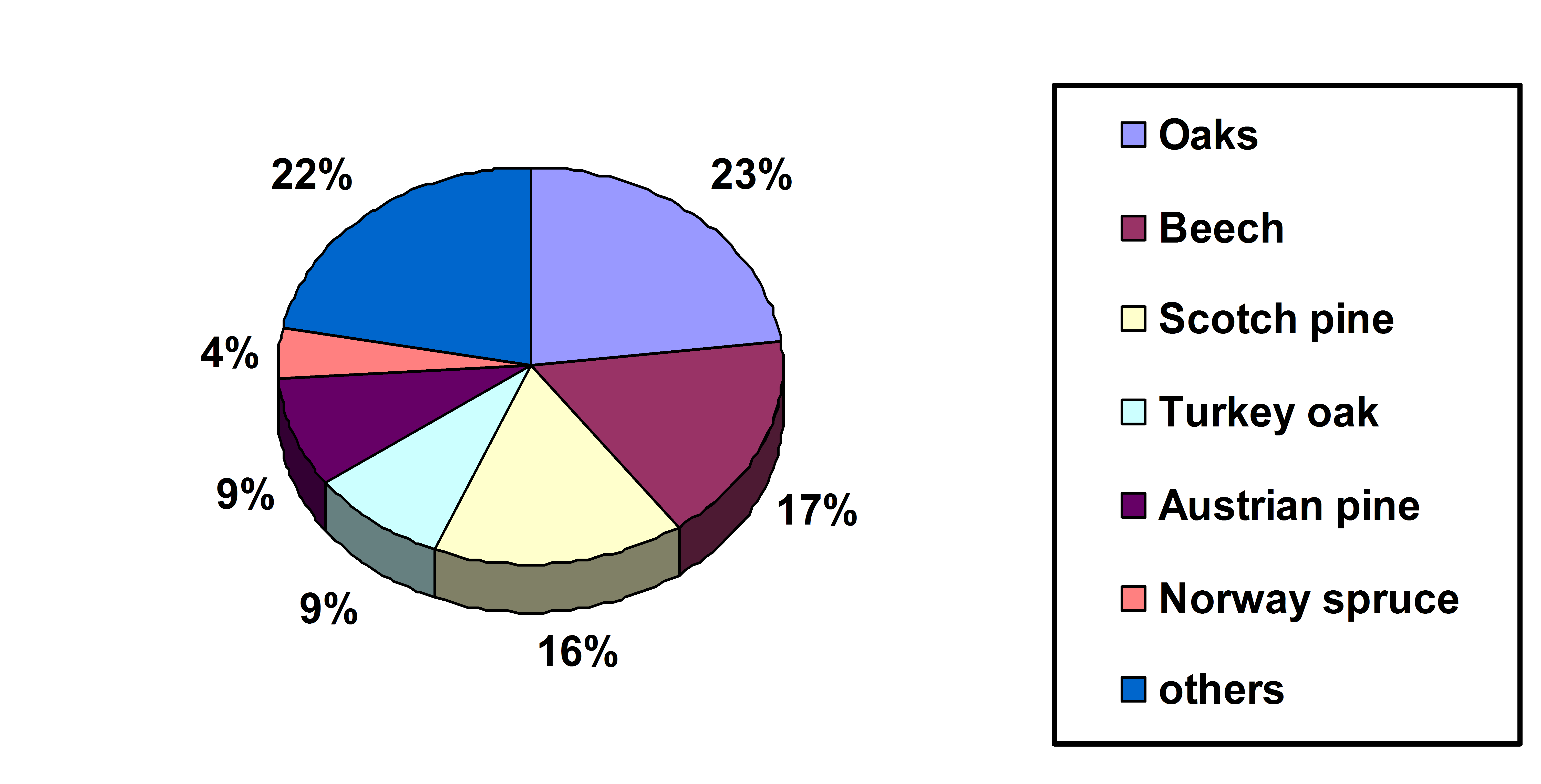 The total forest territory in Bulgaria is approx. 37% of the total country area. More than 90 % of it is afforested. The growing stock exceeds 680 million m3 with an annual increment of about 14 million m3. Тhe ratio of coniferous to deciduous forests is 1: 3. The distribution of the most common tree species is shown on Figure 1.