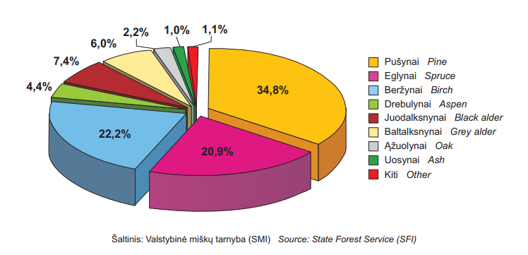 Occupying 1,148,400 ha, coniferous stands prevail in Lithuania, covering 55.8% of the forest area and 44% are deciduous species. The most common tree species are Scots pine, Silver and Downy birch, Norway spruce, Black alder, Grey alder, Aspen and Oak (Fig.2).