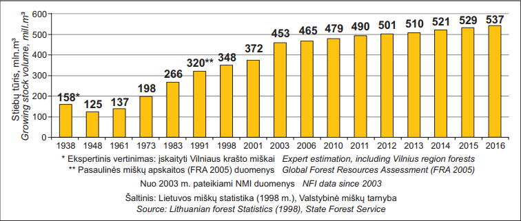 Standwise forest inventory underestimated the volume of stands by 10-15%, therefore the transition to the NFI was made. For this reason, a sudden increase in timber volumes and area of matured stands was observed since 2003. According to NFI data, since 2003 total growing stock volume increased from 453.4 million m³ up to 537.0 million m³. Pine stands accumulated growing stock of 221.0 million m³. In a period of thirteen years they accumulated 41.0 million m³.