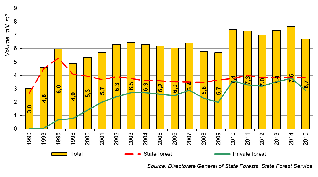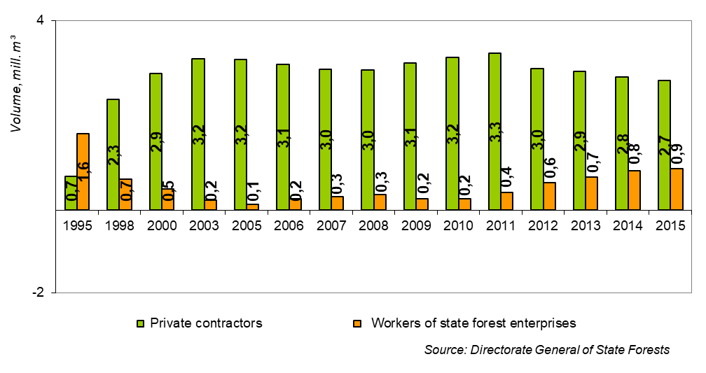 Changes in felling rates in state forests were insignificant over last four years. The amount of round wood harvested in state forests totaled 3.8 million m³ in 2015. From this, 3.6 million were felled by enterprises themselves or by contractors, while stumpage sales made up 0.2 million m³ (see Fig. 4).