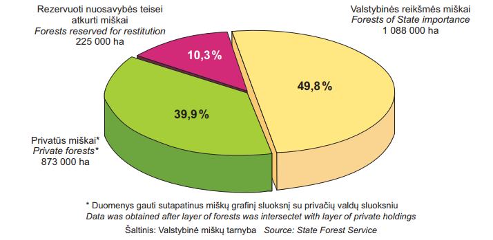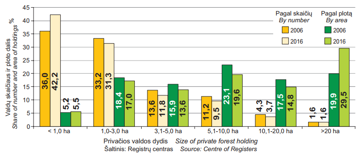 By 1st January 2016, around a half of all forest lands in Lithuania was of State importance – 1088,500 ha. 873,000 ha of private forests were registered in the State Enterprise Centre of Registers.